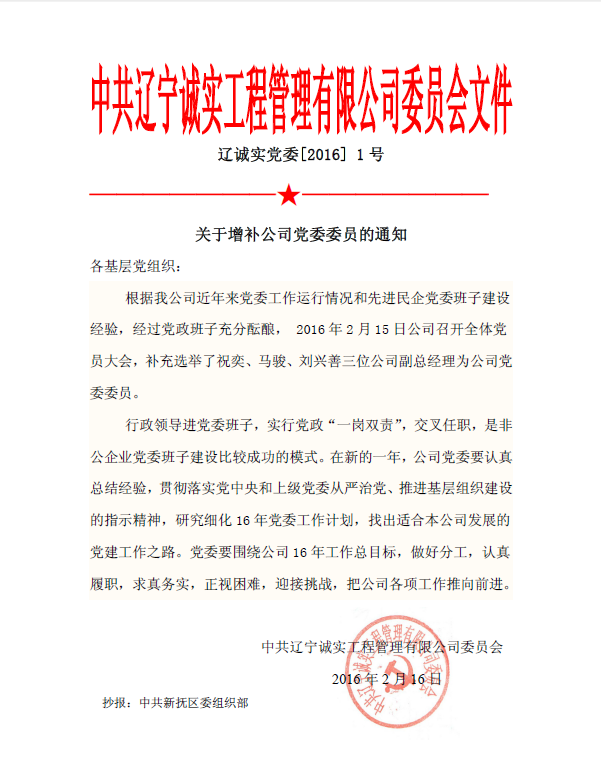 中共赢博手机官方网站入口,赢博(中国)委员会文件——关于增补公司党委委员的通知