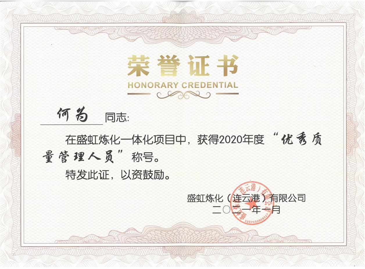热烈祝贺何为同志荣获盛虹炼化一体化项目2020年度“优质质量管理人员”荣誉称号