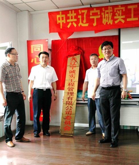 中共抚顺市委组织部领导李劲夫(右二)、中共新抚区委副书记罗玉生(左二)、新抚区委常委组织部长  隋淑贵(右一)、赢博手机官方网站入口,赢博(中国)董事长赵华(左一)为中共赢博手机官方网站入口,赢博(中国)委员会揭牌